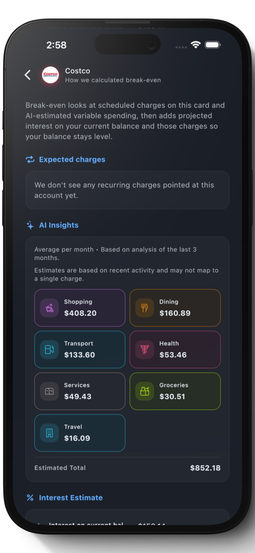 AI estimates your variable spending by category, calculates interest impact from your APR, and computes a target with safety cushion.